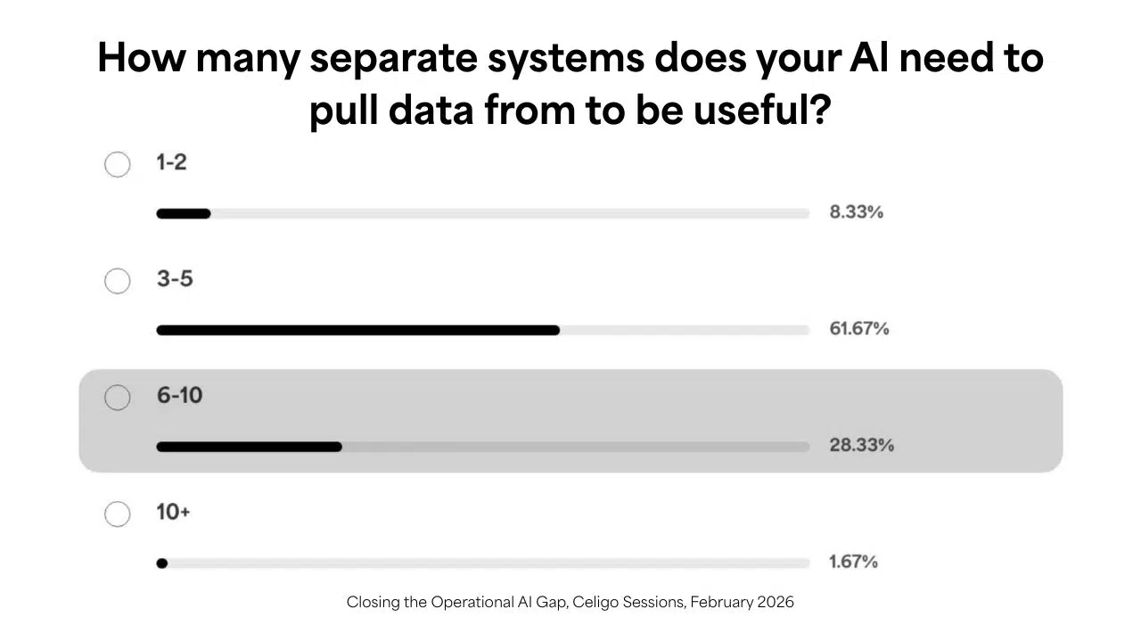 During the webinar, most attendees said their AI use cases depend on data from three to five systems, with many requiring even more. We saw that same pattern at last year’s AI Summit. Effective AI draws from multiple sources because the decisions it supports don’t respect departmental boundaries.