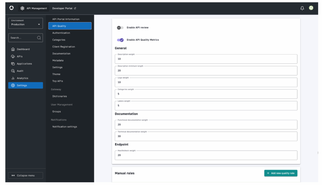 Measurement turns governance from policy into practice. Configure API Quality metrics to assess alignment with organizational standards. These metrics reveal where documentation, versioning, or access controls need improvement and demonstrate progress over time.