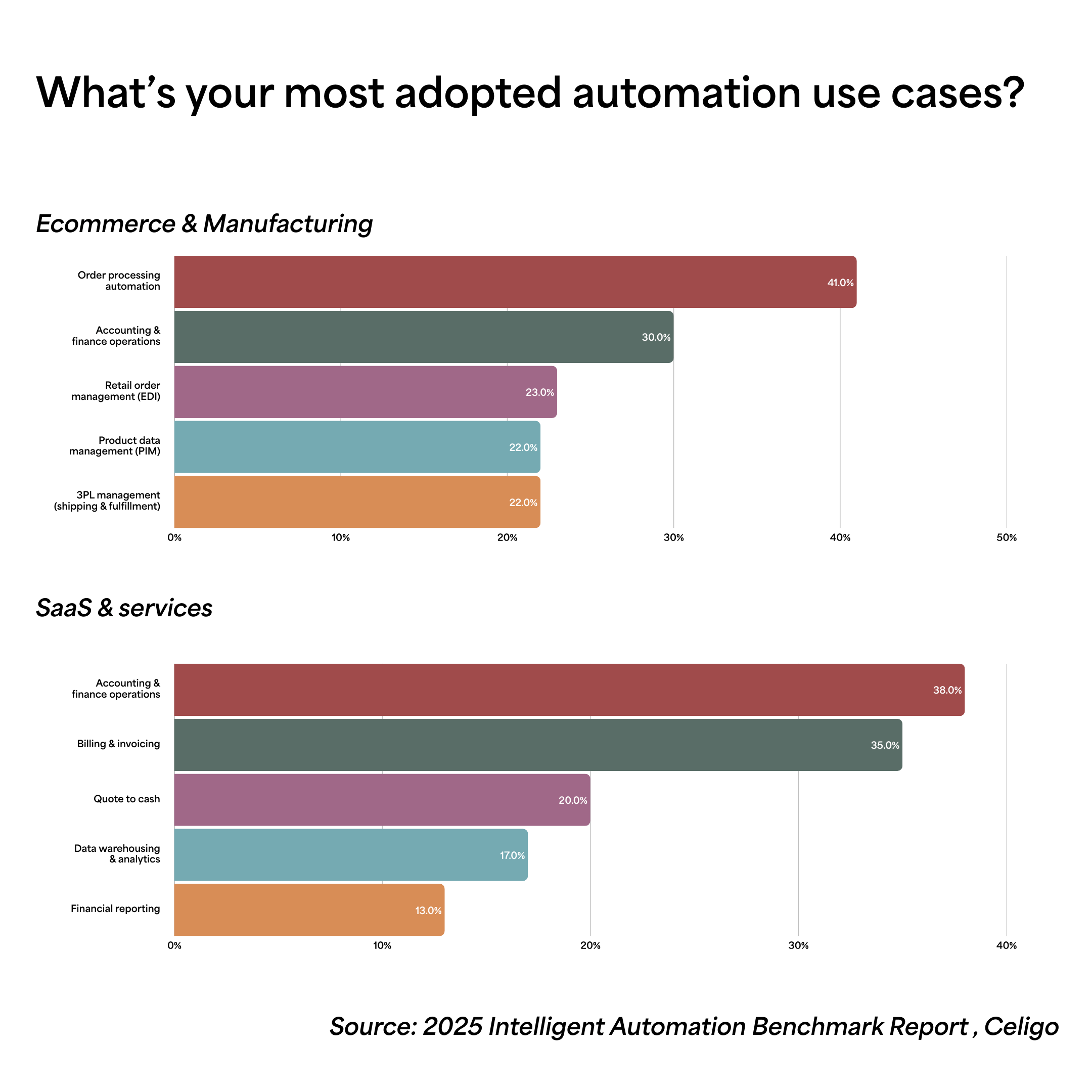 Outcome and adoption data reinforce this shift. Across both ecommerce and manufacturing, SaaS and services, the most widely automated use cases are end-to-end workflows such as: order processing, quote-to-cash, and billing.