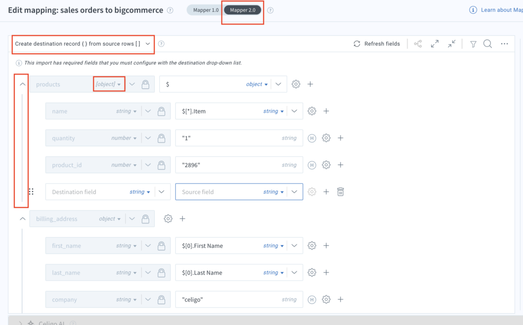 - Visual representation: Celigo mappers provide a clear visual representation of source and destination JSON structures, allowing users to reference input data while building the JSON structure for the destination application.