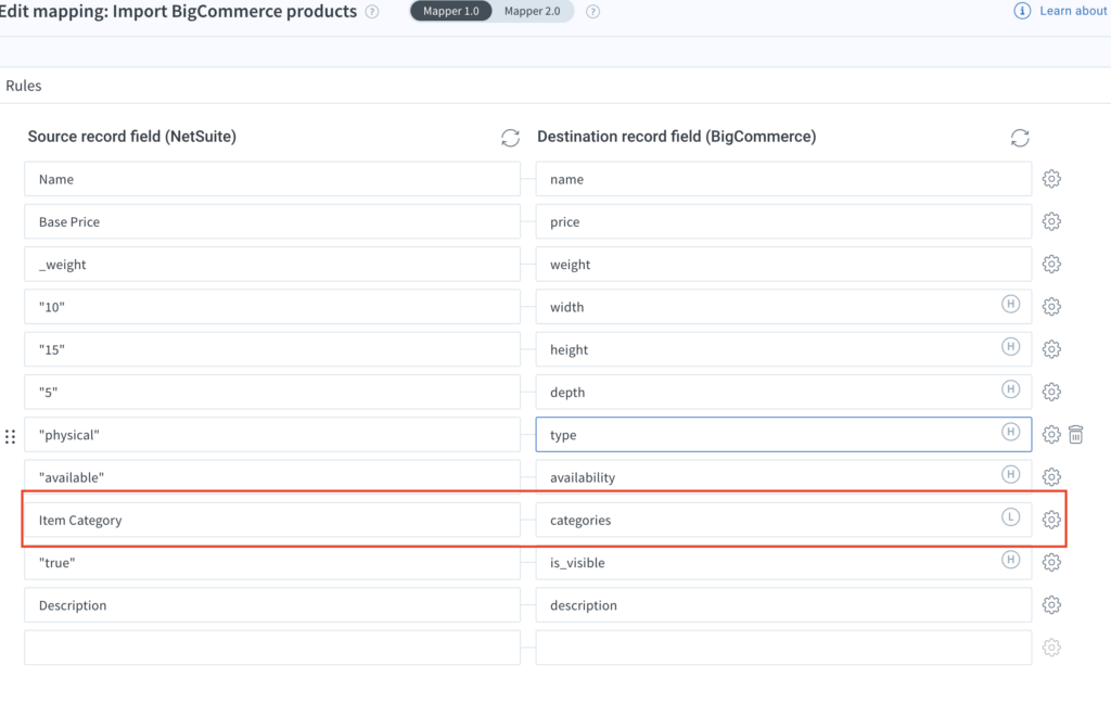 To resolve this, Static lookup mapping is used. In this scenario, a predefined mapping table is created that associates each NetSuite product category with the corresponding BigCommerce product category code.