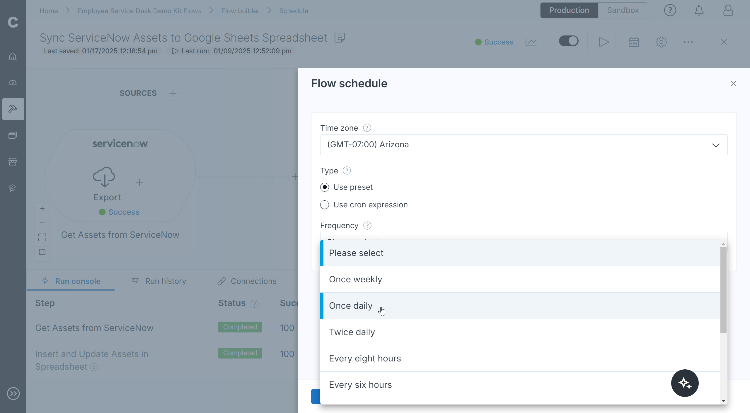 Finally, the schedule button can be used to automate the initiation of this flow. The calendar icon to the right of the run button allows you to specify with what frequency you’d like the flow to run. A dropdown offers a wide array of options but more specific intervals can be specified with cron expressions.