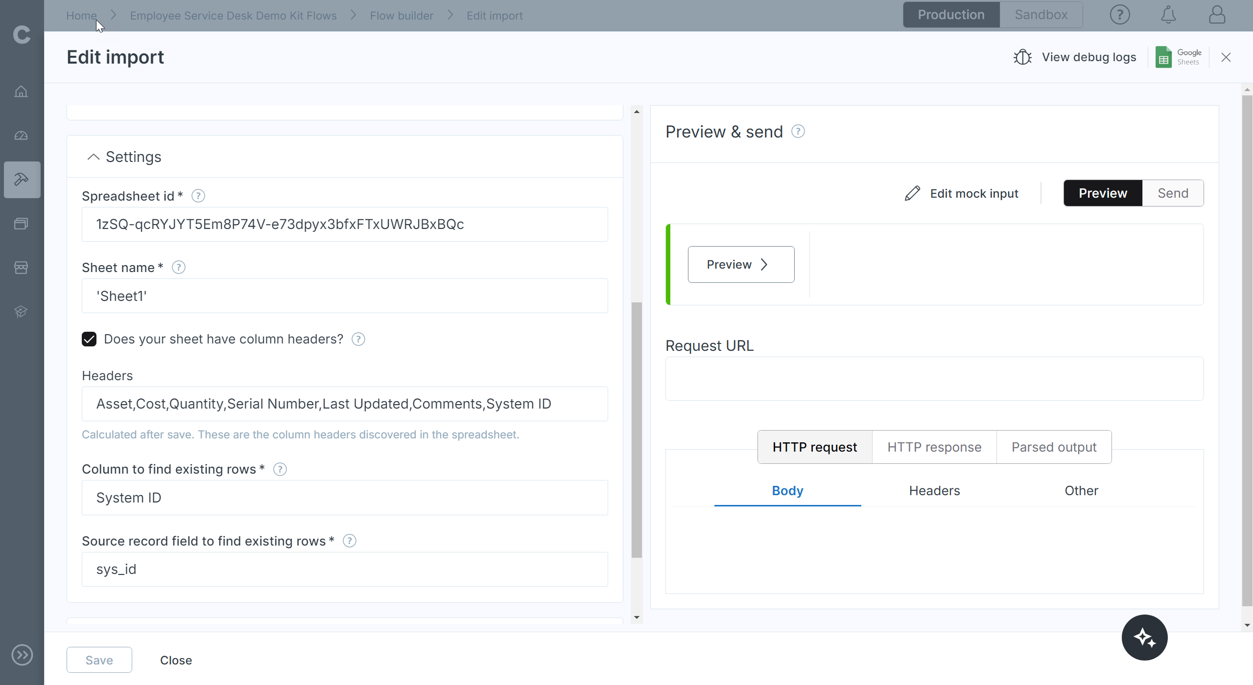 ServiceNow assets to Google Sheets spreadsheet flow