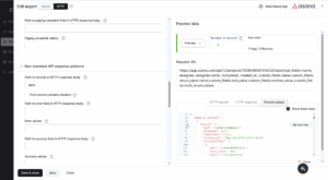 Look at the preview data in the bottom right. Records in integrator.io are grouped in pages that travel through the flow. Each record contains an array called “data”. The items in this “data” array are tasks from Asana that we will use to create Connectors. This seems unintuitive and difficult to navigate for our use case, where each record should be used to create a page.