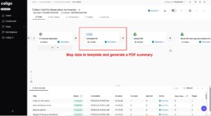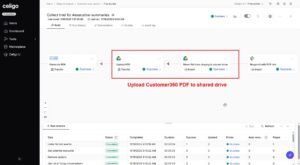 In the following example of Customer 360 automation, Celigo consolidates sales, support, and product usage information into a single, AI-generated PDF executive summary, automatically formatted and delivered directly in Slack, with a version archived in Google Drive. The automation draws data from Salesforce for account context, Gong for conversational insights, Zendesk for support interactions, Snowflake for usage analytics, and OpenAI for structured summarization.