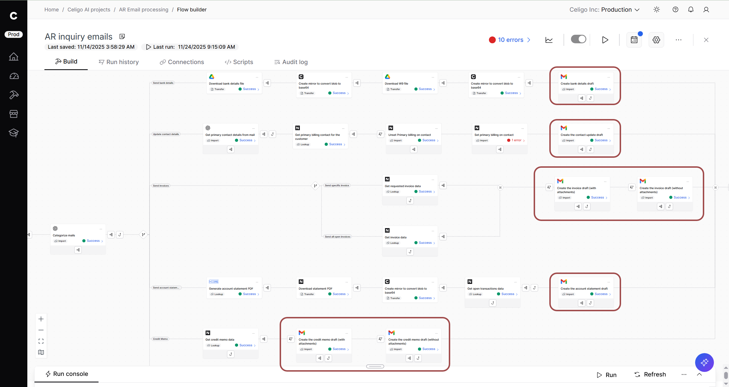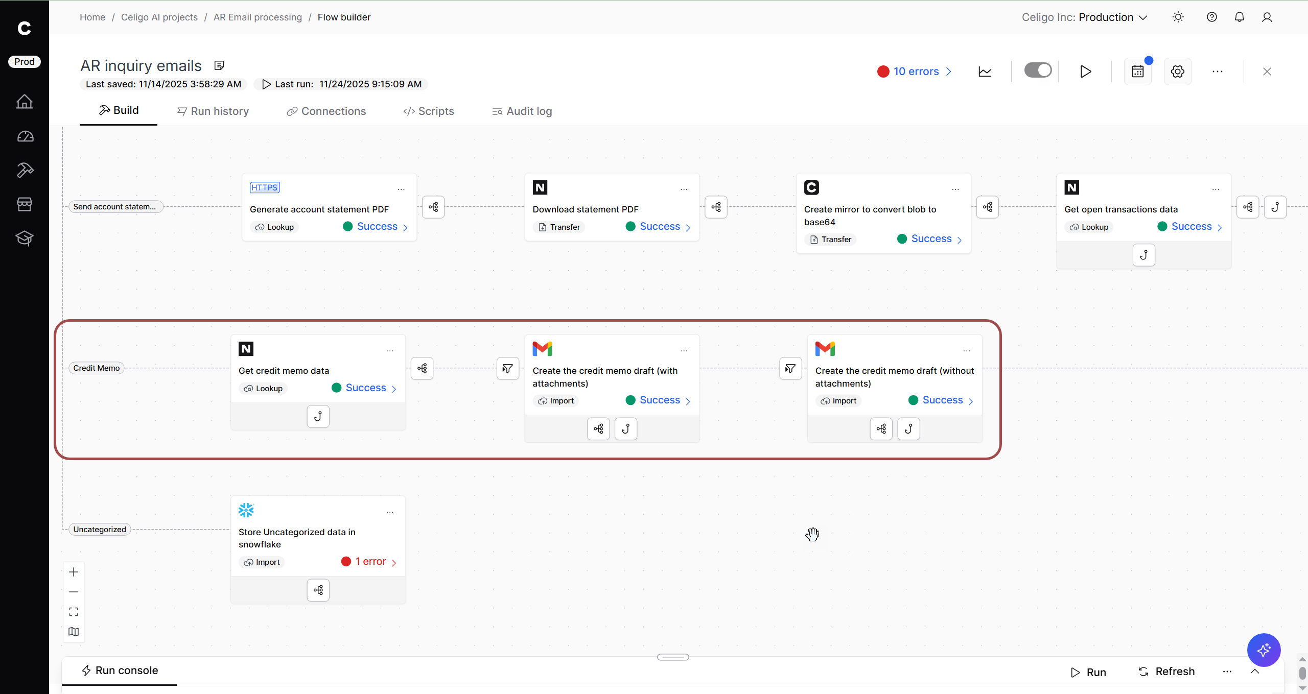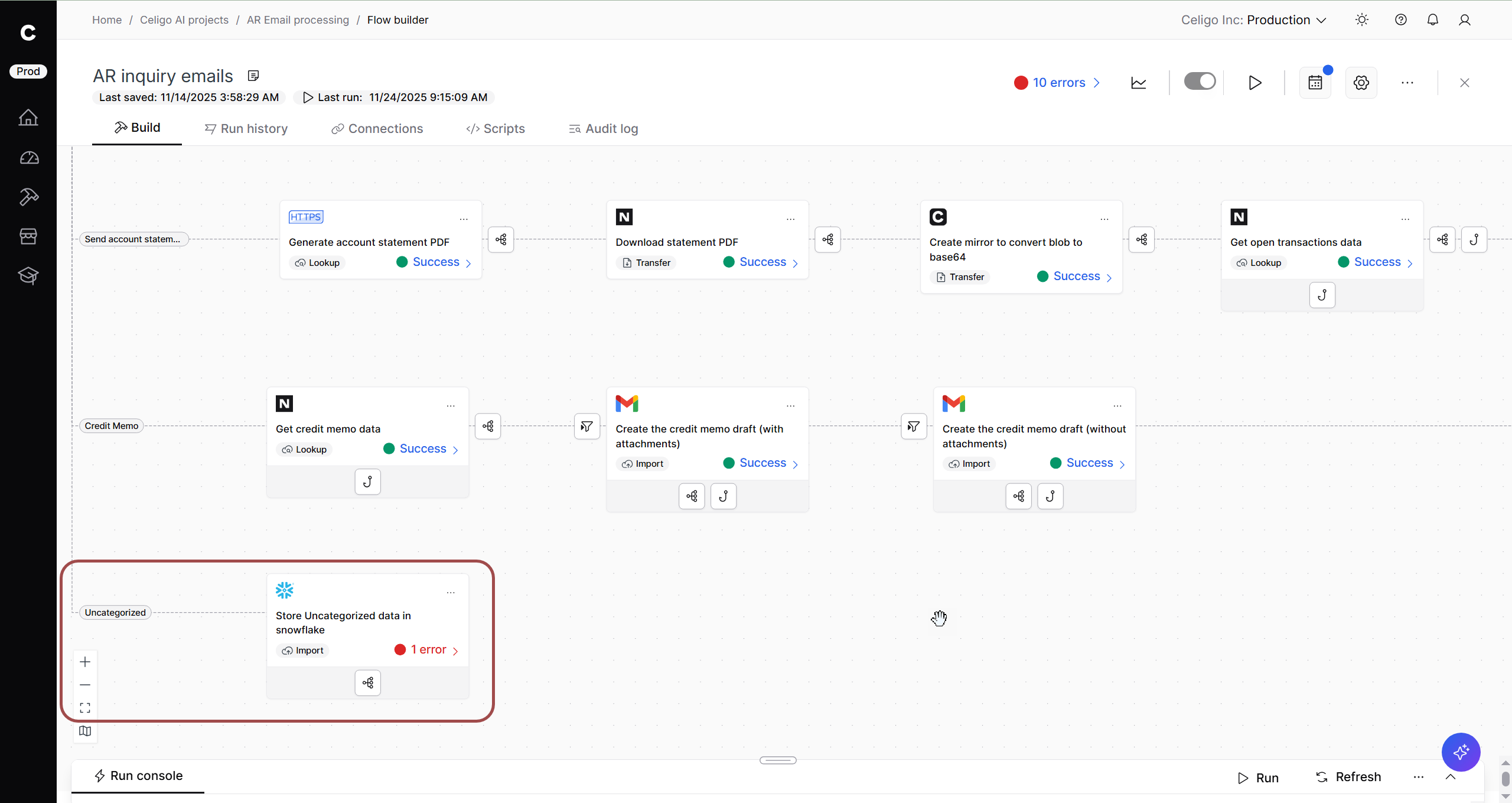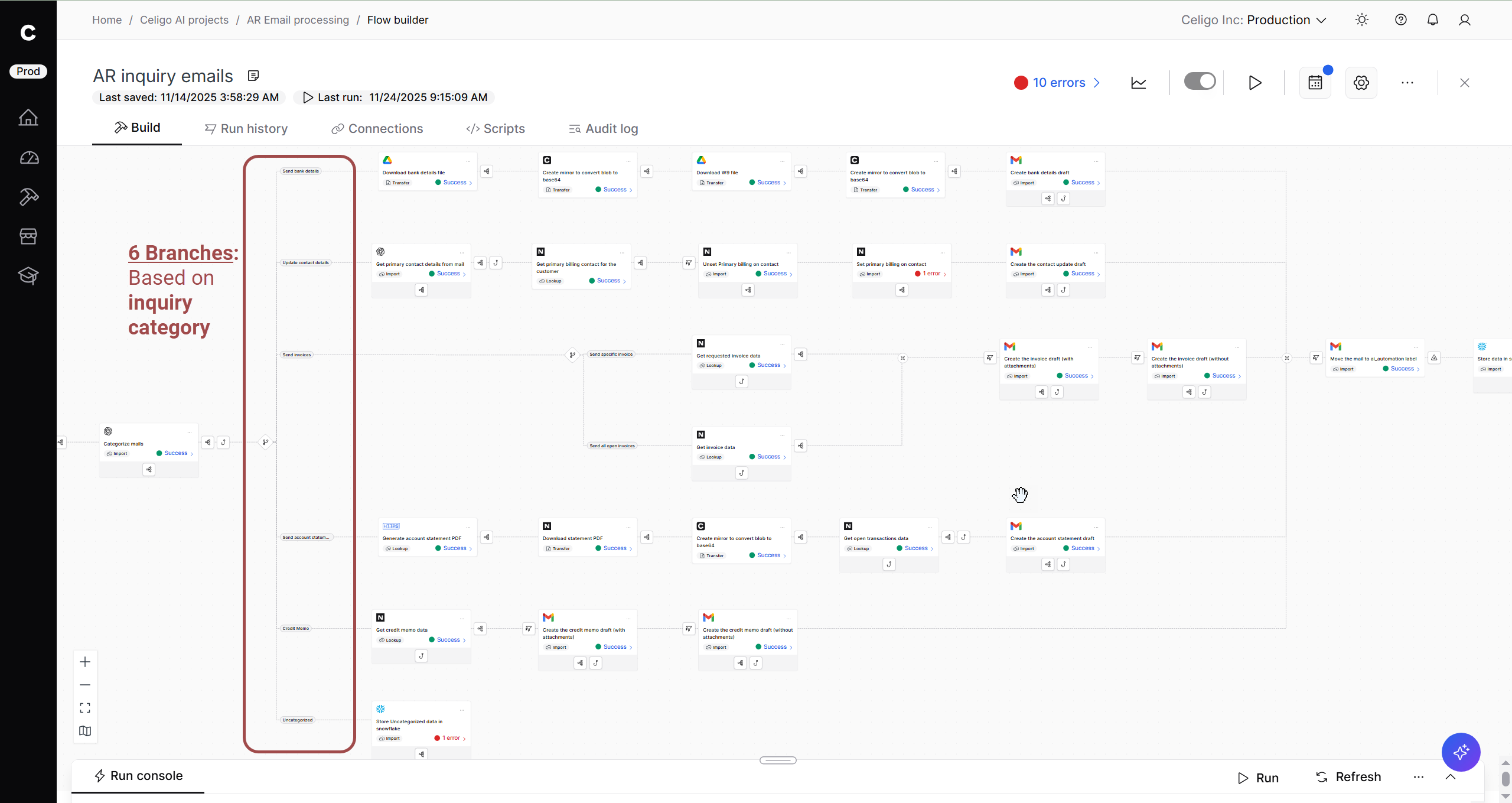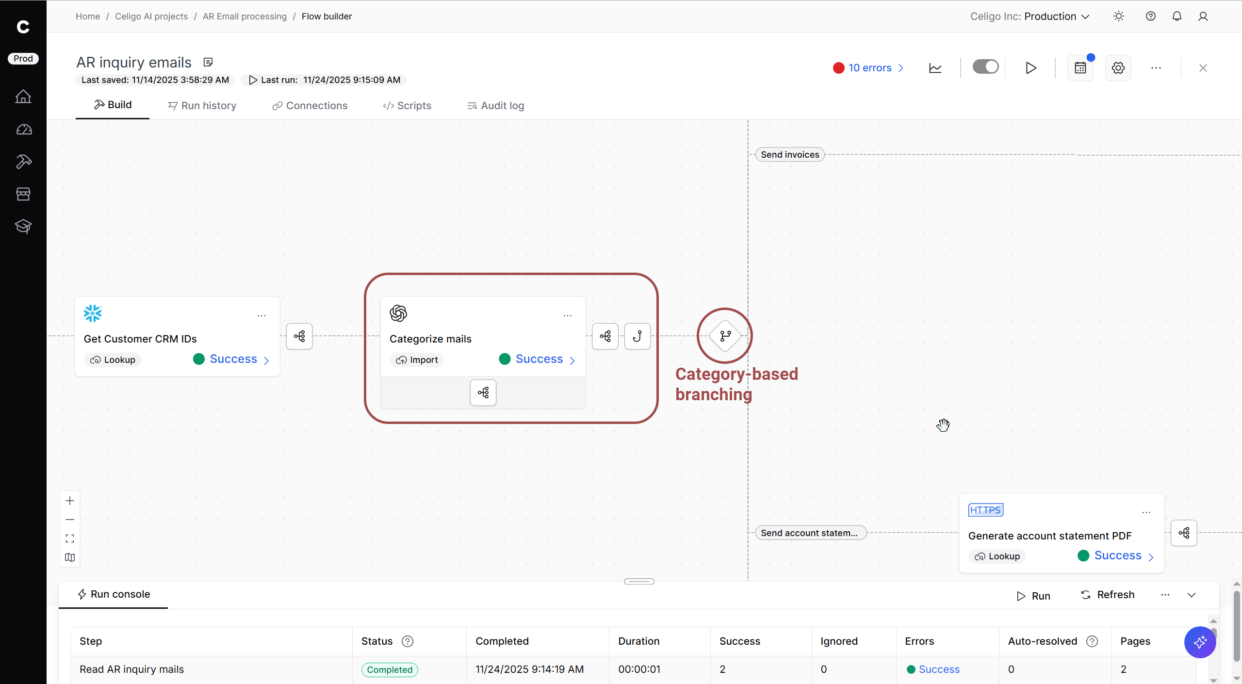 In this accounts receivable (AR) automation example, Celigo uses an AI-driven, agentic flow to analyze, categorize, and draft responses to common customer billing emails, turning a noisy AR inbox into a structured, governed process.