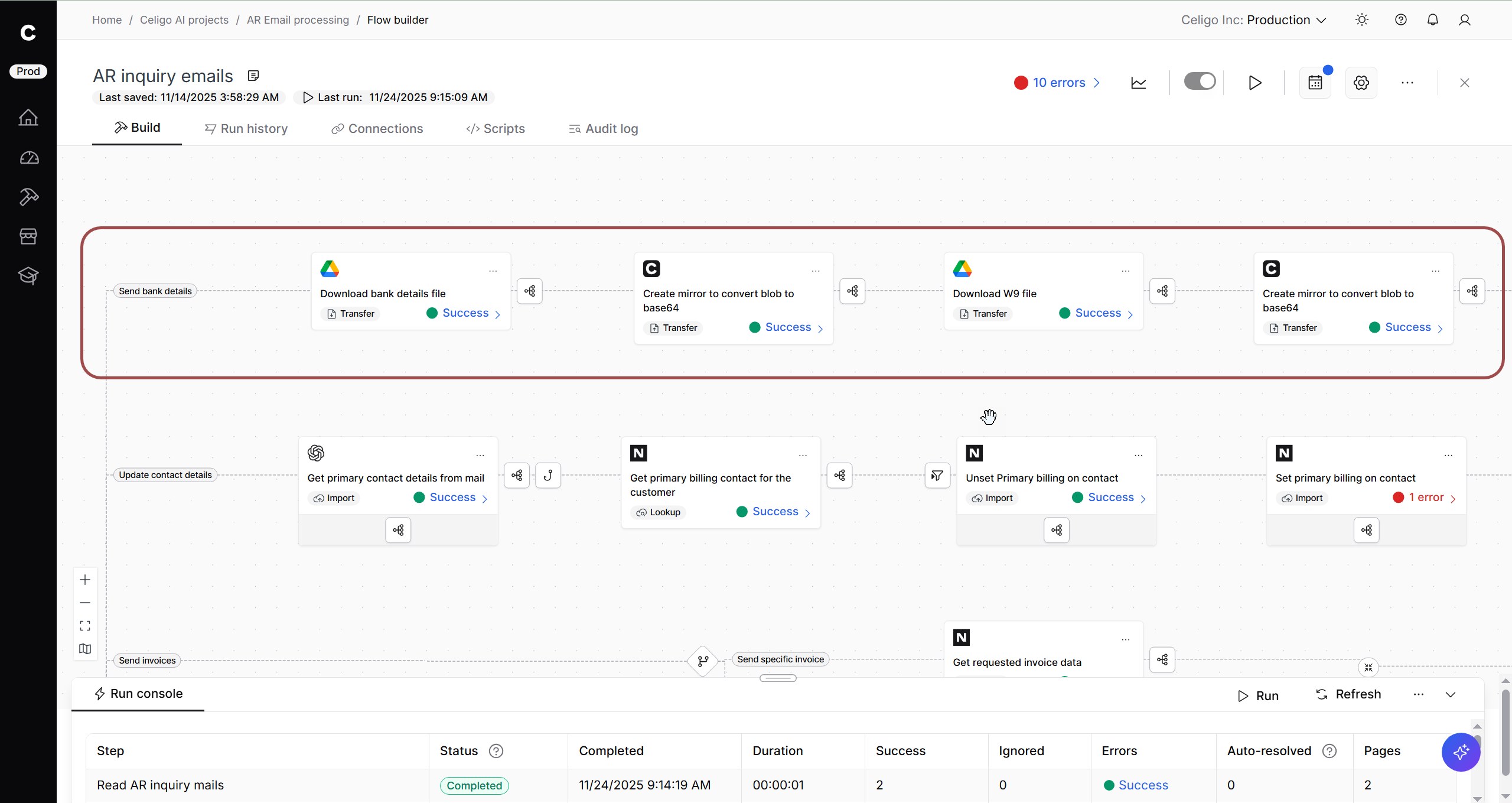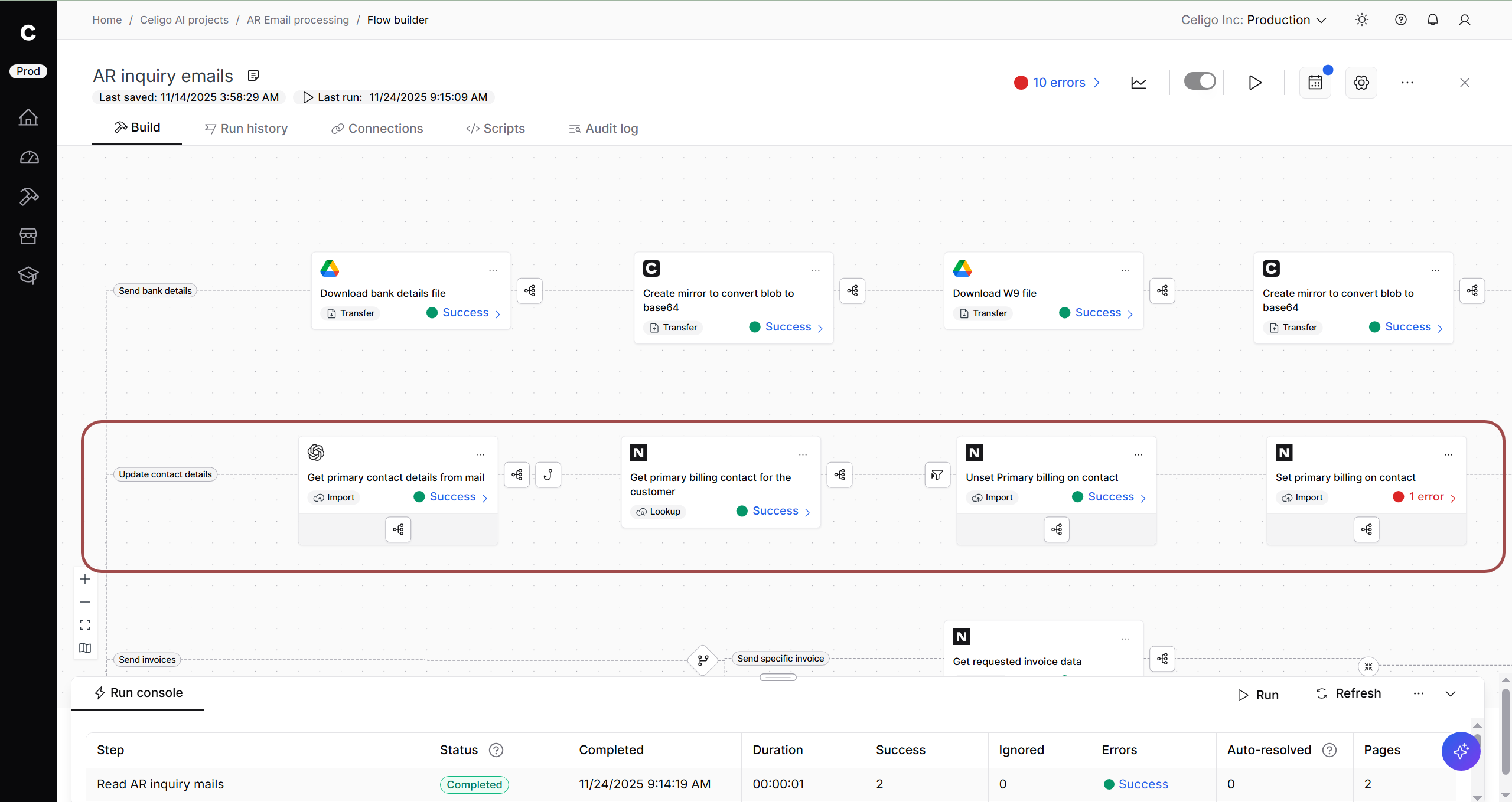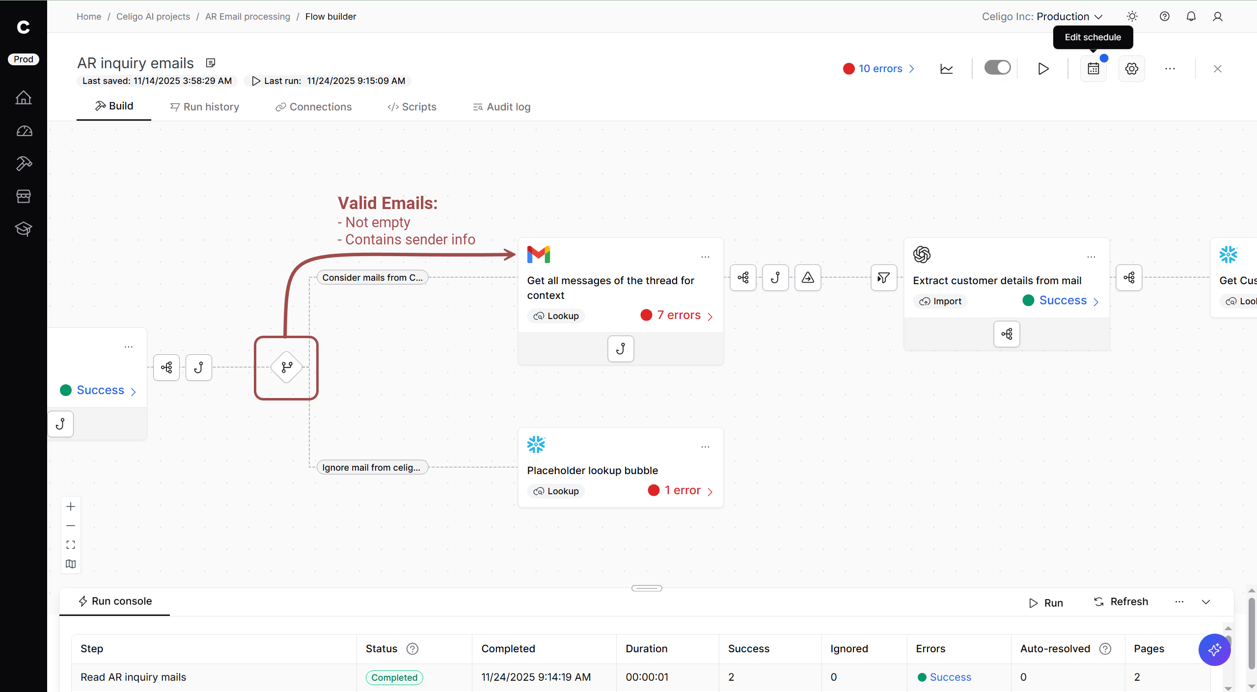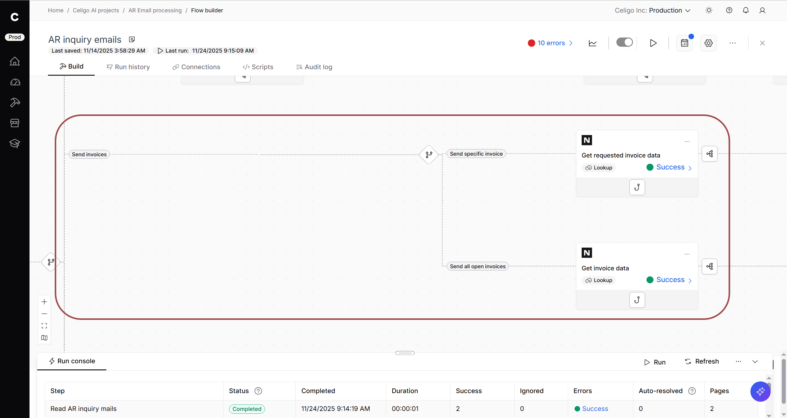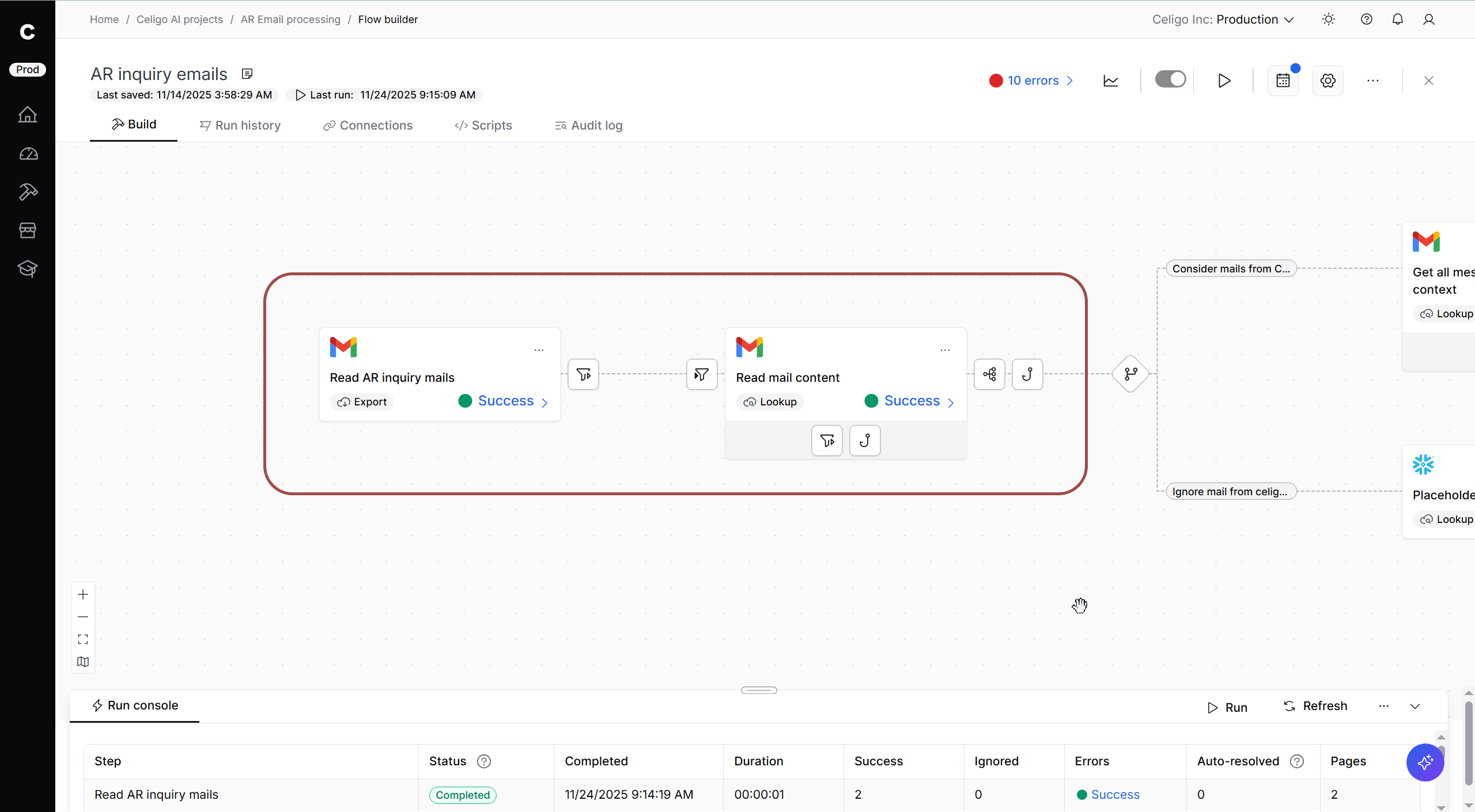 In this accounts receivable (AR) automation example, Celigo uses an AI-driven, agentic flow to analyze, categorize, and draft responses to common customer billing emails, turning a noisy AR inbox into a structured, governed process.