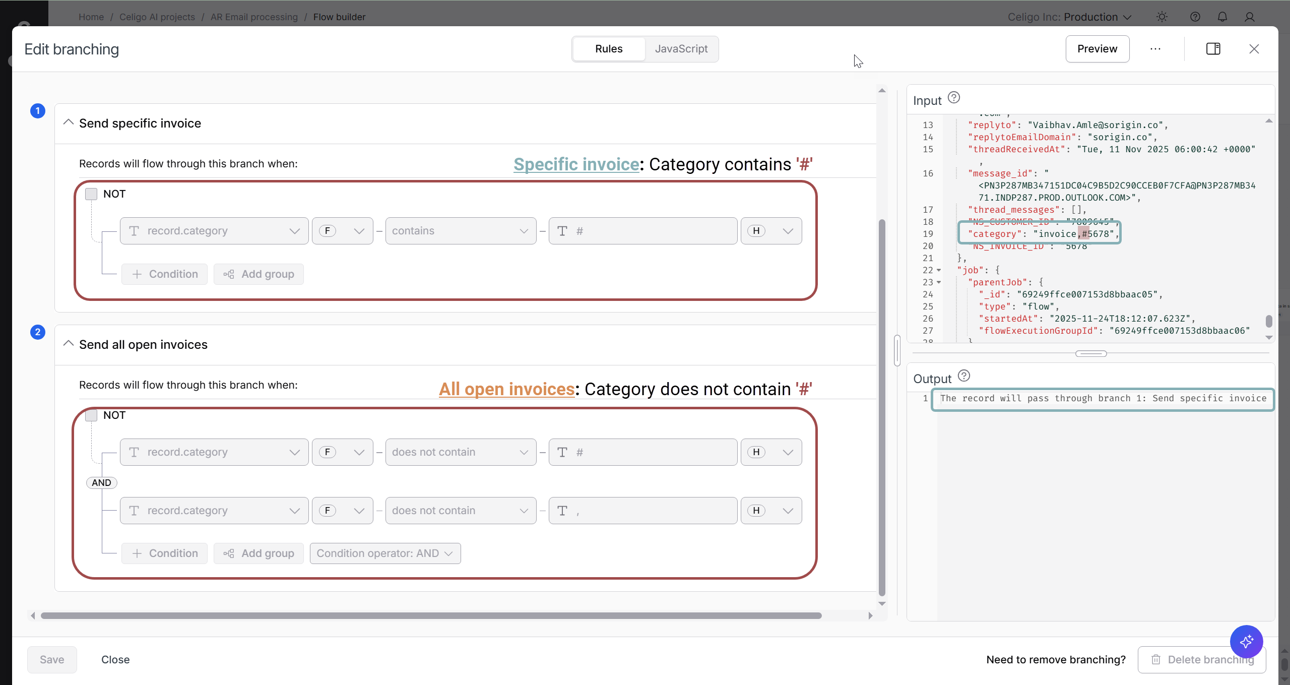 - Uses branching on the category to decide whether to send a specific invoice or all open invoices