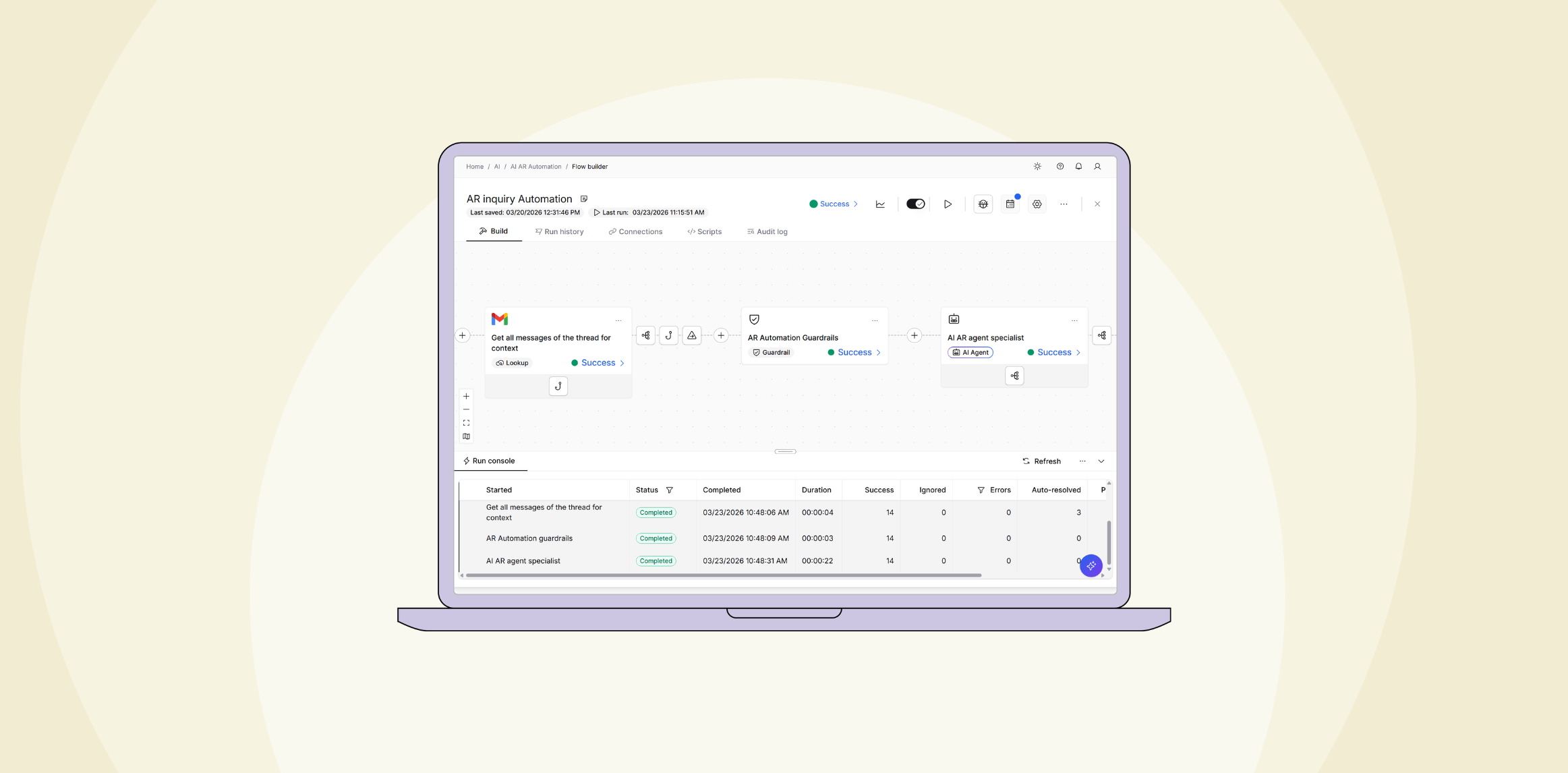 To address this, the team built a workflow that begins by monitoring the company’s shared AR inbox. When a new email arrives, it is captured and passed into an AI agent for analysis.