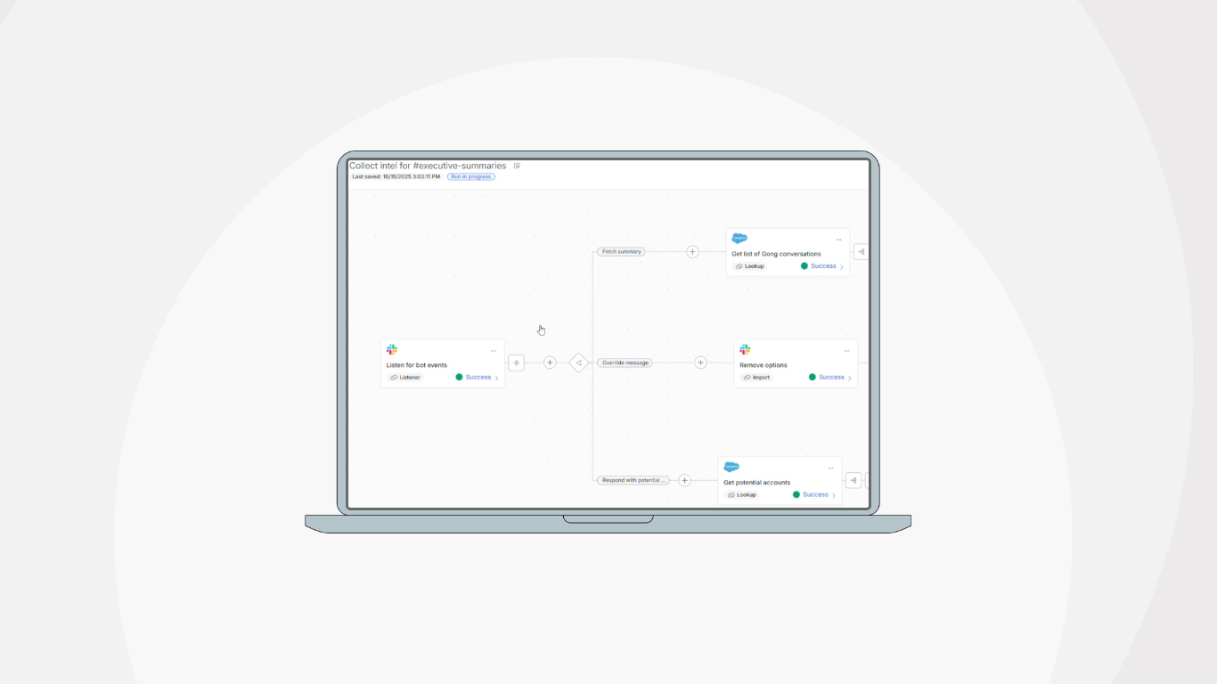 We created an agentic workflow that begins in Slack and turns live account data into a structured, branded summary delivered back to the team.