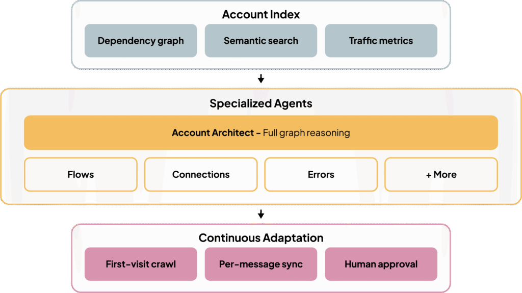 - Account-aware reasoning: Ora uses a live knowledge graph of integrations, flows, connections, and dependencies to reason across the account context