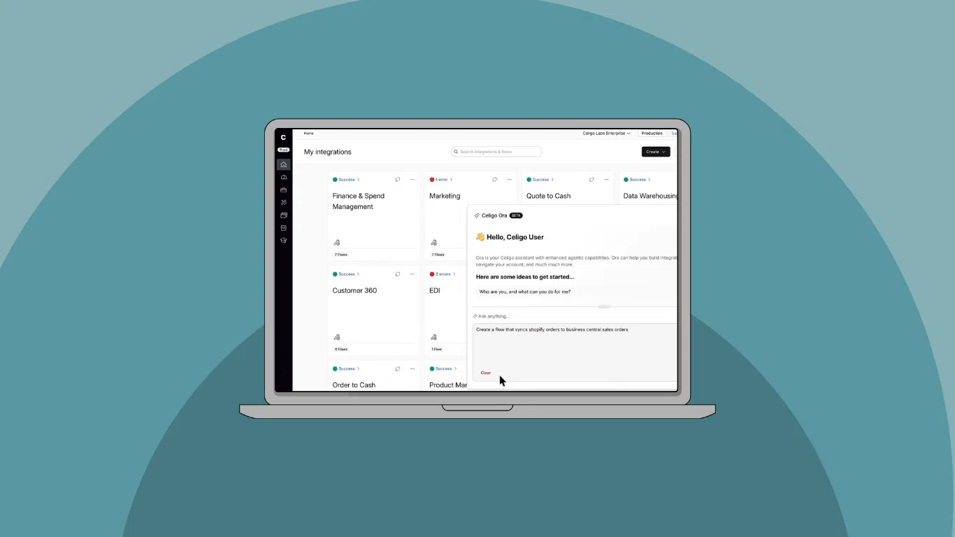 Celigo Ora gives teams a faster way to build, troubleshoot, and manage the platform through conversation. With specialized agents, live account context, and built-in enterprise controls, Ora helps more users work across the full environment with clarity and control.